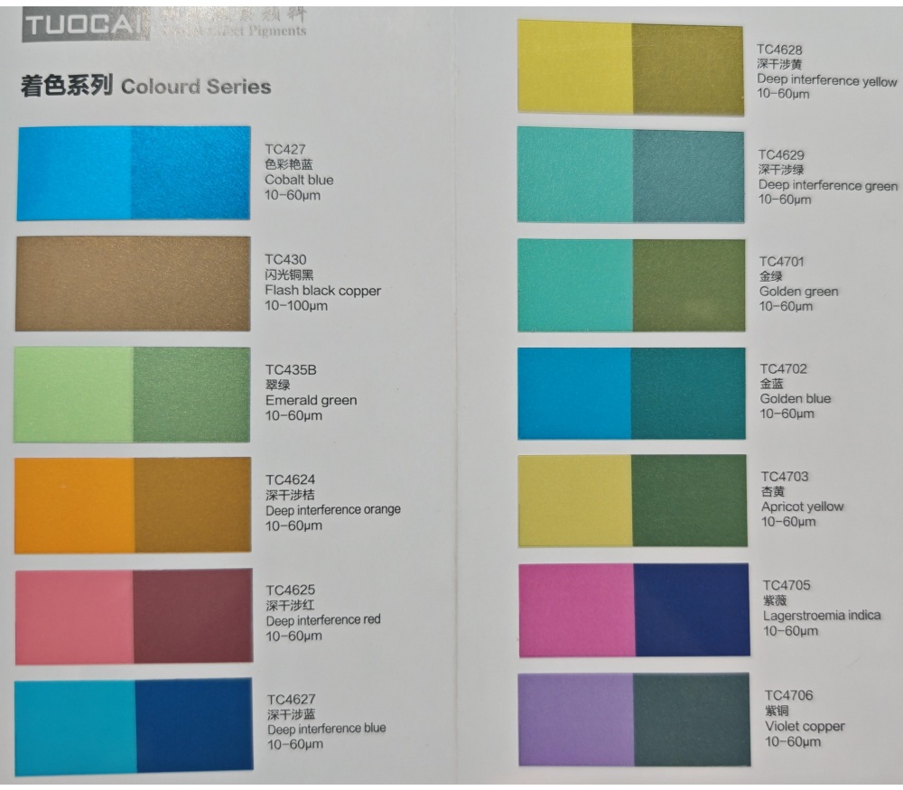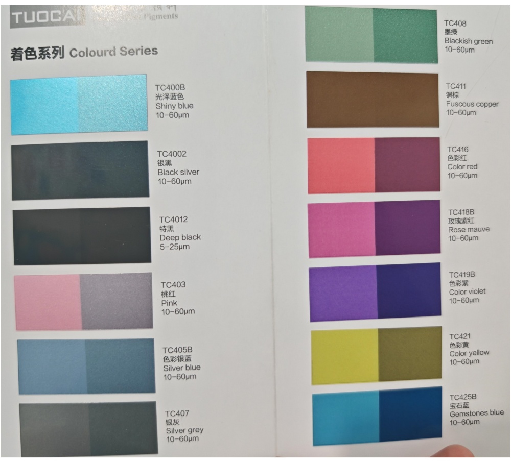拓彩彩色系列提供丰富的颜色选择,几乎可以满足用户对任何颜色的需求。当吸光性有机颜料与光泽金属系列效果颜料颜色相同时,反射色与侧视色接近,且颜色更鲜艳、纯度更高。当色相不同时,反射色与侧视色不同,从而产生颜色变化。